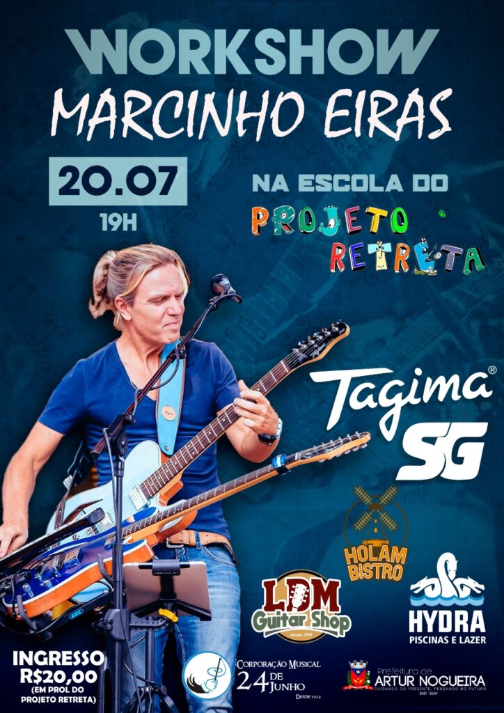 O Projeto Retreta, da Corporação Musical 24 de Junho, sediará um Workshow com o renomado guitarrista Marcinho Eiras na próxima quarta-feira (20), às 19h, em Artur Nogueira. O evento será aberto ao público em geral e a entrada será mediante a ingresso com custo de R$ 20 – cujos valores serão destinados ao projeto.